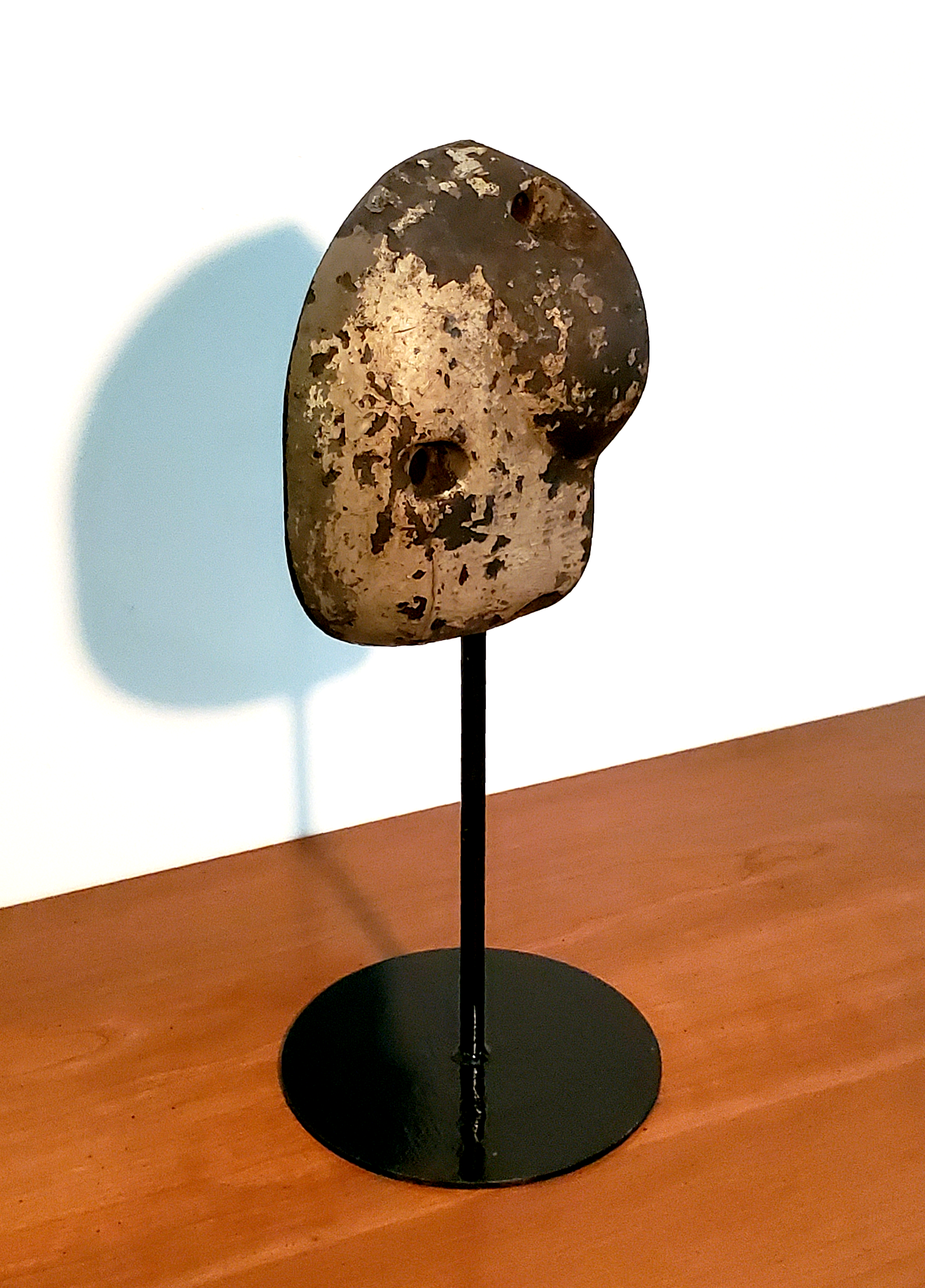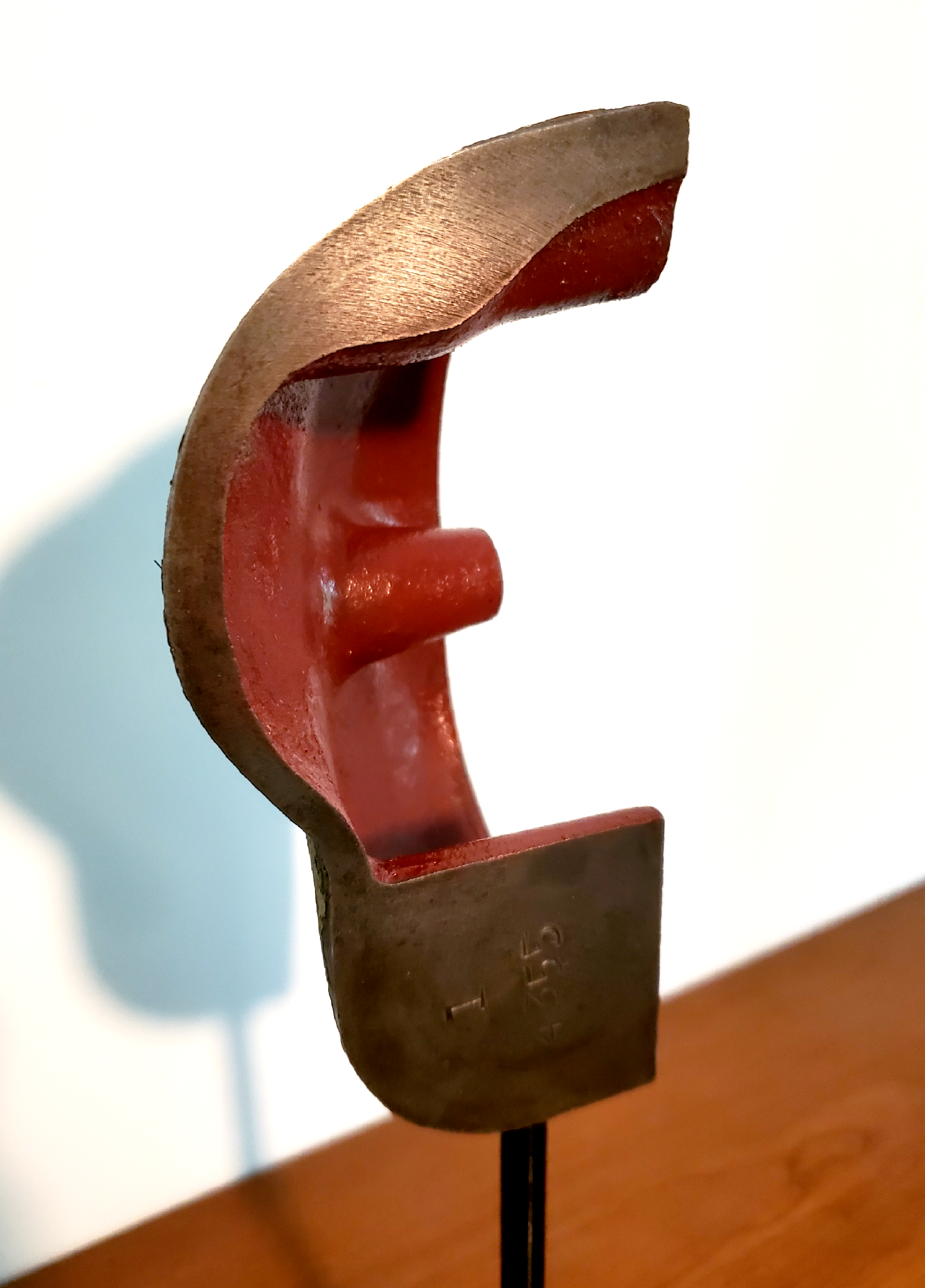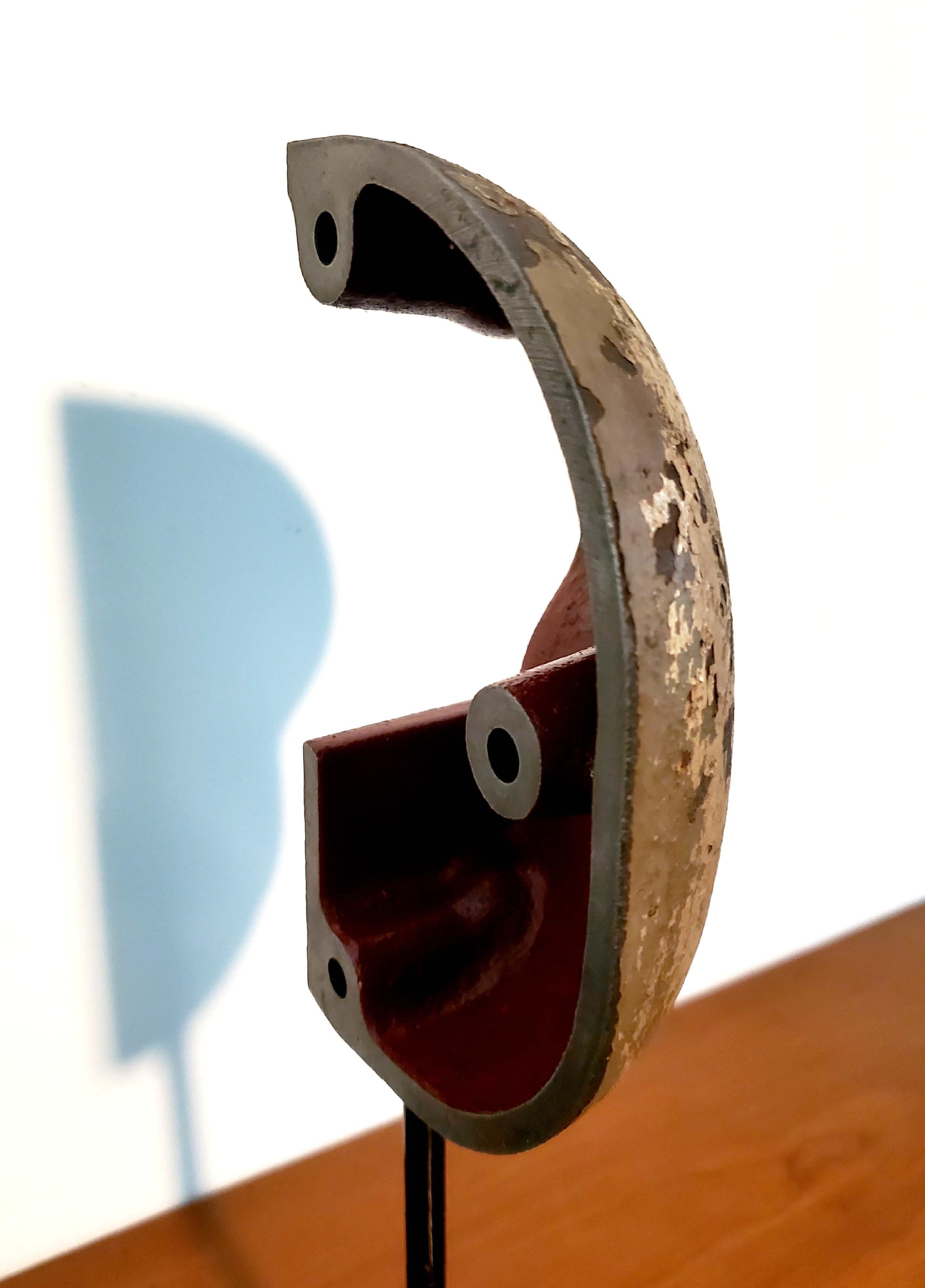 Comprised of a found cast iron machine component, once a part of a housing that protected shafts and gears. Its form arises from and exemplifies a variety of processes and conditions, both meticulously planned and accidental. It began as a rough casting, molten metal poured into a sand mold that favors curved, filleted shapes as the liquid flows to fill the void. Then, this rugged object was measured and planed down to exacting squareness and flatness on two sides to fit precisely in it’s eventual home. Perfect round holes pierce an undulating form, yet placed just so to mesh harmoniously. In operation, it would have blended seamlessly into the rest of the machine, the inside holding lubrication and the outside protecting from metal chips and wear. Over many years, the tear and battering of its work has left the outside scratched, scraped, and rusted, with paint peeling from its grimy surface. The interior has escaped such harsh conditions, having bathed constantly in a circulating pool of oil, keeping it in a nearly pristine state. As such, it takes on qualities akin to a crystal geode that shares a similar weathered, dull exterior hiding a bright, faceted interior. Today, this highly-engineered piece of metal with all its careful interaction of curve and hard line, organic and abstract, once laboriously designed and crafted, has become scrap as marching technological progress rolls on.